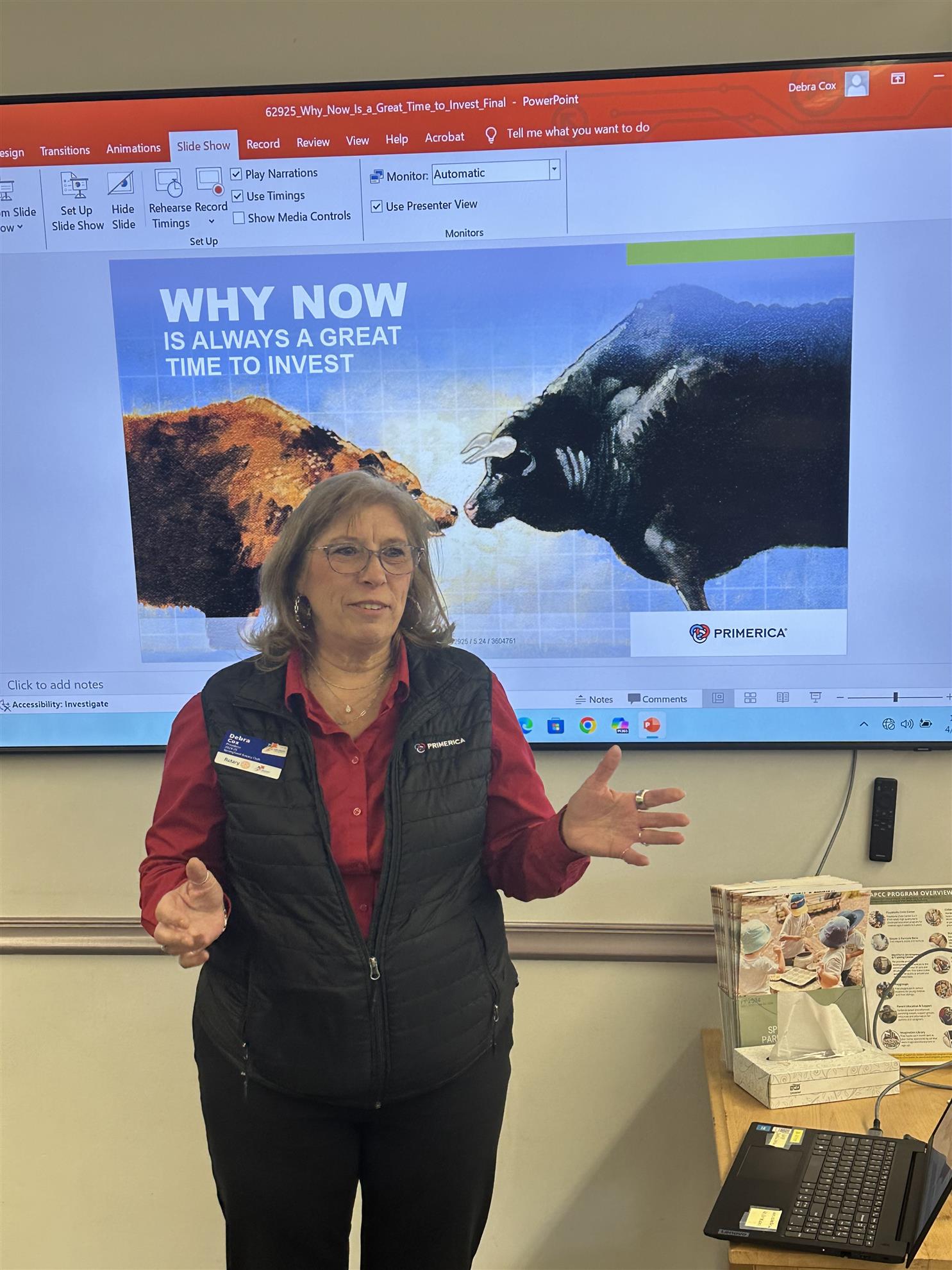 Springfield Rotary Club President Deb Cox, a financial advisor with Primerica, talked about why now is a great time to invest. She recommended that you should invest with your head and not the headlines.