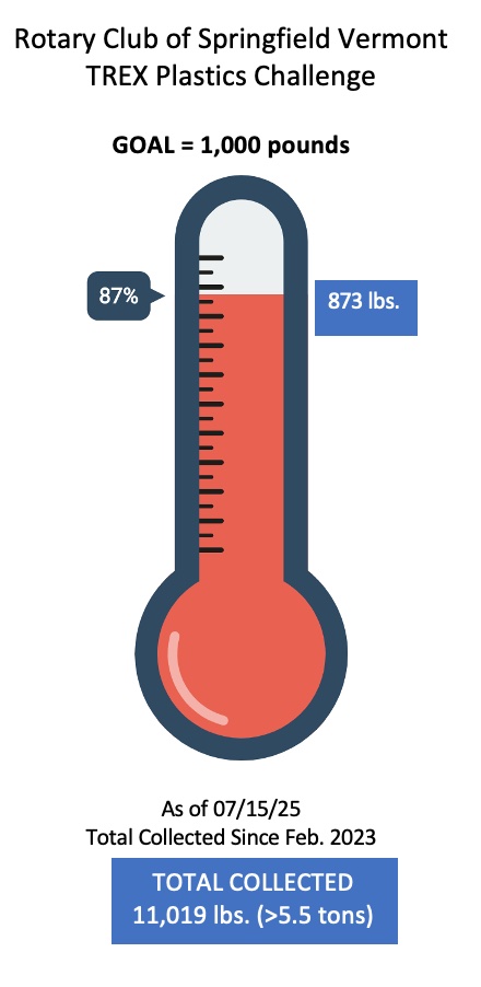 We have collected 873 pounds of plastic film towards our goal of 1000 pounds of plastic film for the thirteenth recycled bench that will be given to Springfield Parks & Recreation. To date, 11,019 pounds of plastic film (over 5-1/4 tons!) have been removed from the waste stream since we started this project in February of 2023, delivered to Shaw's Supermarket, and heading to Trex for recycling. Please continue to bring your plastic film to the Springfield Town Library. NOTE: We need volunteers to help sort the plastic at the Library. For more info, contact Alan.