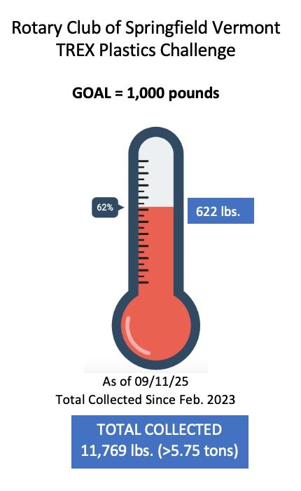We have collected 622 pounds of plastic film towards our goal of 1000 pounds for the fourteenth bench which will honor Lori Muse Gurney and the club’s 95th anniversary. To date, 11,769 pounds of plastic film (over 5.75 tons!) have been removed from the waste stream since we started this project in February of 2023, delivered to Shaw’s Supermarket, and heading to Trex Company for recycling. Please continue to bring your plastic film to the Springfield Town Library. NOTE: We need volunteers to help sort the plastic at the Library. For more info, contact Alan.