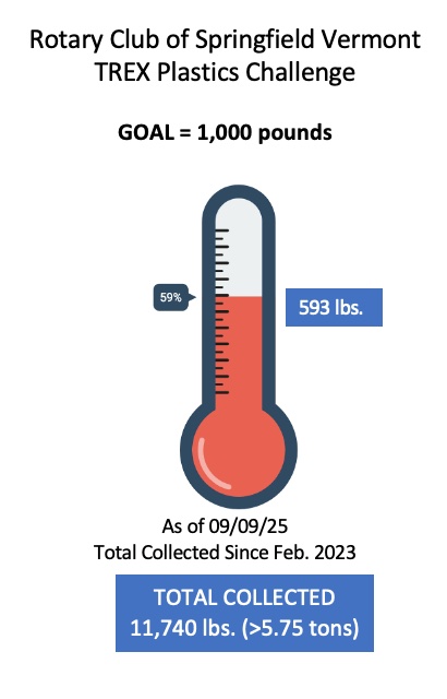 We have collected 593 pounds of plastic film towards our goal of 1000 pounds for the fourteenth bench which will honor Lori Muse Gurney and the club’s 95th anniversary. To date, 11,740 pounds of plastic film (over 5.5 tons!) have been removed from the waste stream since we started this project in February of 2023, delivered to Shaw’s Supermarket, and heading to Trex Company for recycling. Please continue to bring your plastic film to the Springfield Town Library. NOTE: We need volunteers to help sort the plastic at the Library. For more info, contact Alan.
